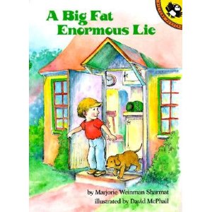 A Big, Fat Enormous Lie by Marjorie Weinman Sharmat and illustrated by David McPhail (one of my favourite illustrators!) is a book we can all relate to easily. A little boy lies over one small thing and his lie comes alive in the form of a monster, following him everywhere, bothering him, sitting on his stomach. The monster keeps growing and growing and growing until it can only be escaped by . . . telling the truth. Phew! The relief! This little book sure inspired some powerful writing from our reading group. We all recognized that lies can be pretty powerful but not as powerful as the truth 🙂