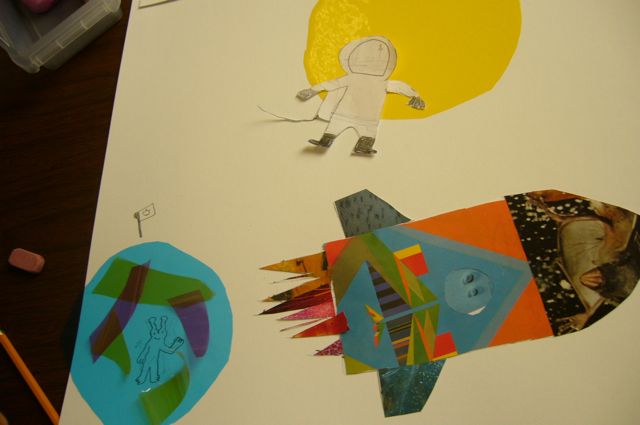 Students made collage rockets, drew astronauts and today worked on the composition of their pieces – placing rocket and astronaut in a space scene along with planets. Such fun!