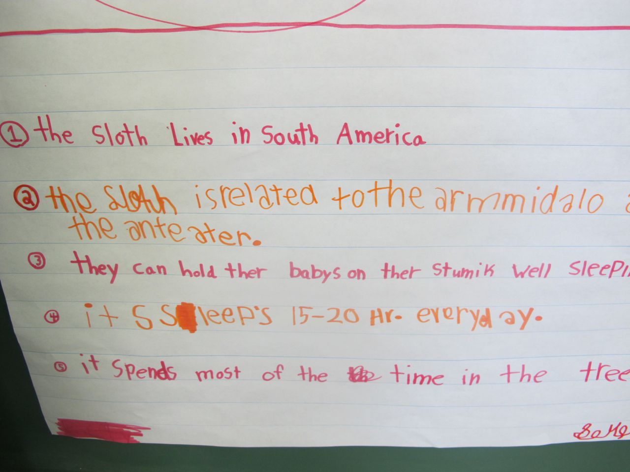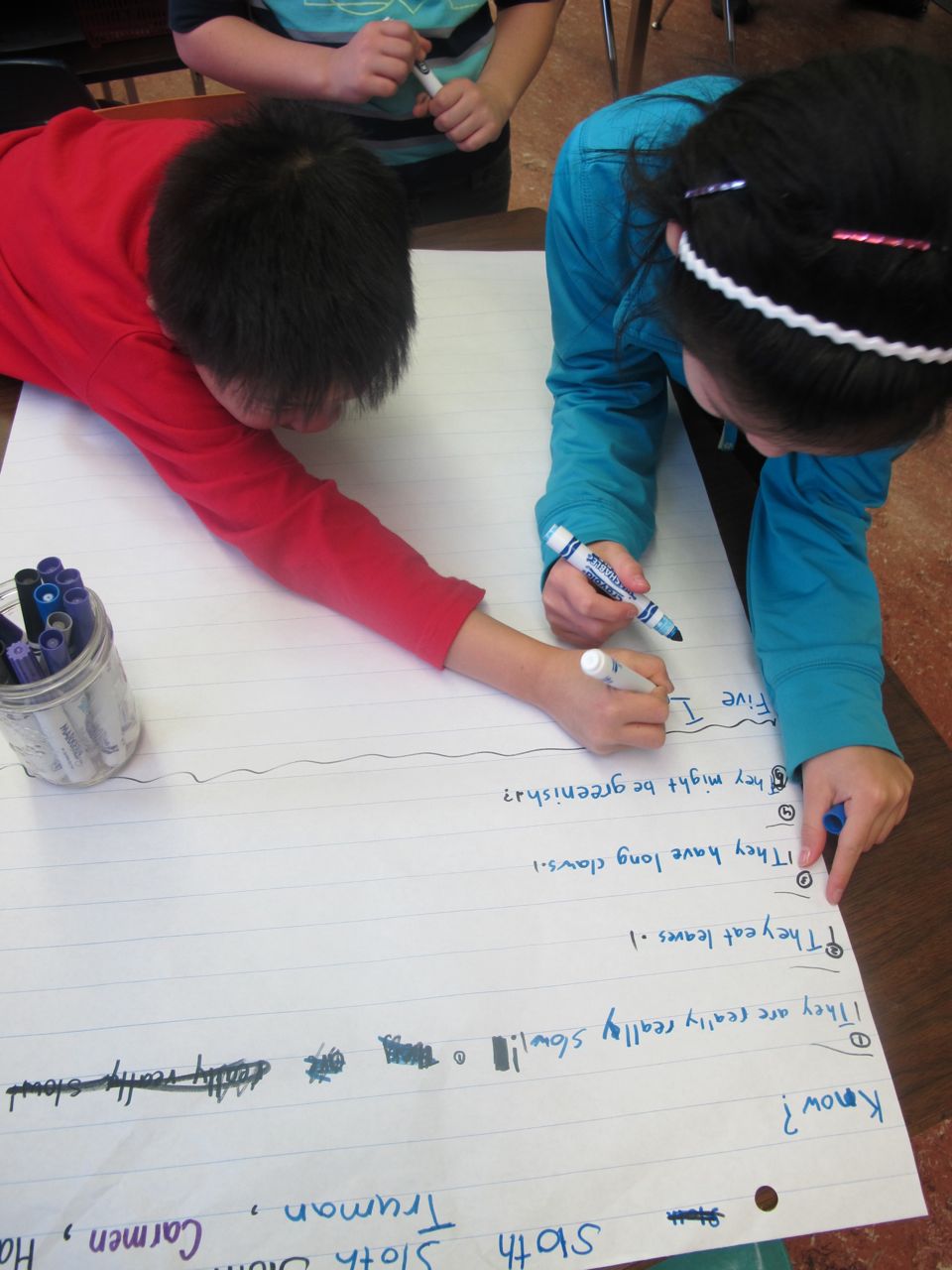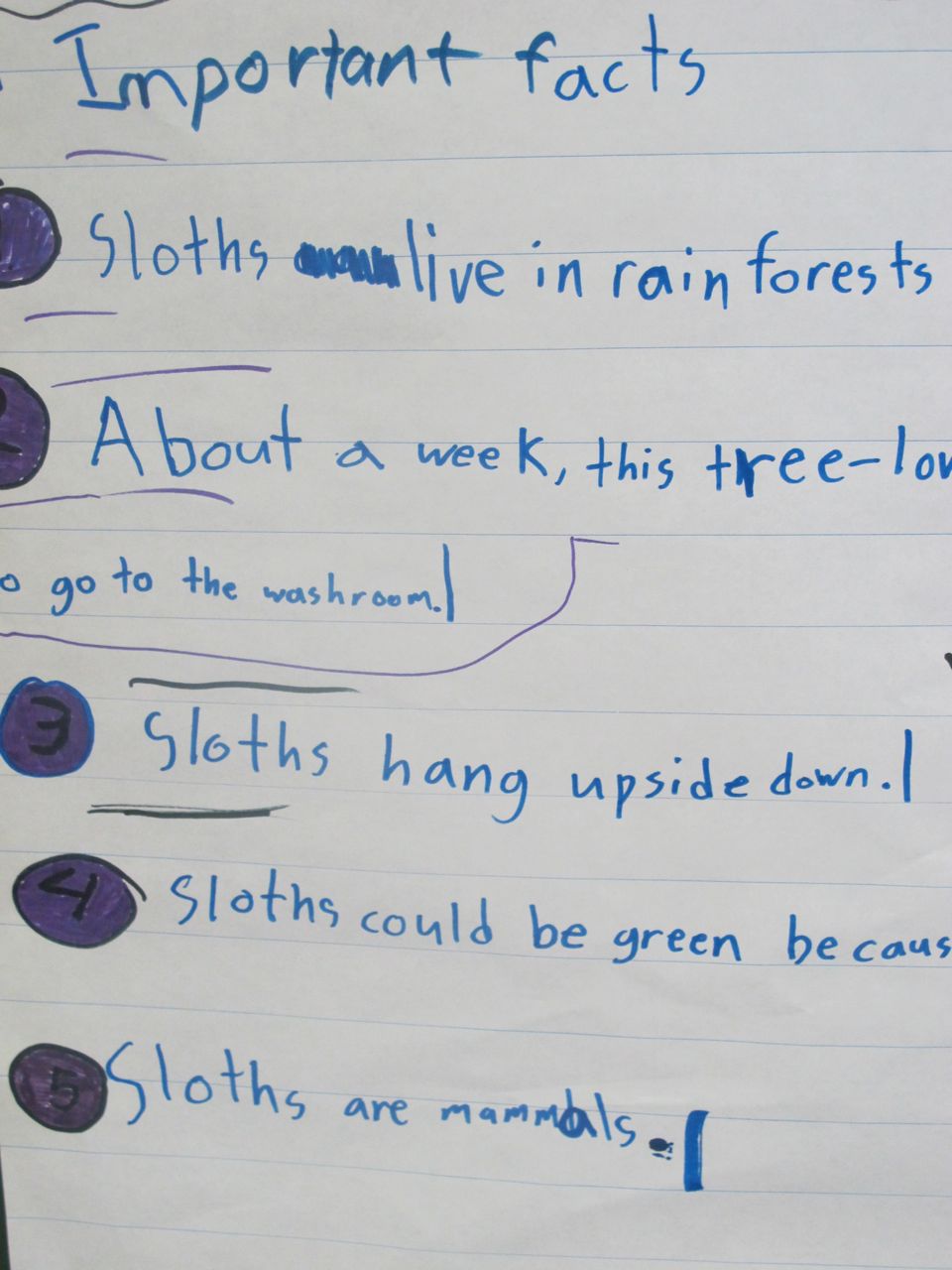 Students noticed that some things were on many of the lists: where the sloths lived, how long they slept each day and that they hung upside down. Other facts were different. We decided that we needed to come up with criteria about what is important to know about an animal so that we could figure out what are the most important facts. This will be for next time! We are off along the road to learn how to determine importance!