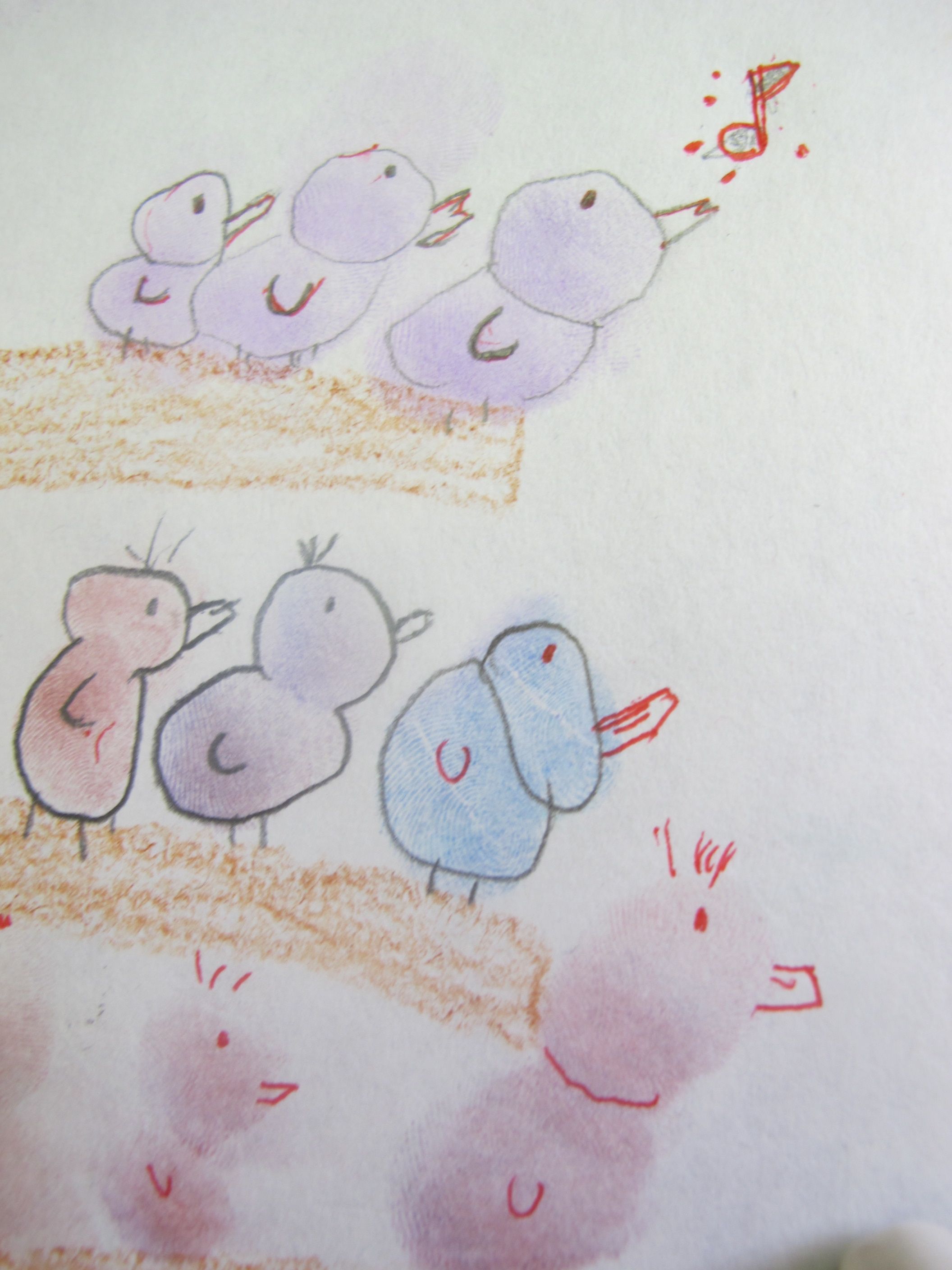 Because we are studying birds, because I happened upon Ed Emberley’s Fingerprint book on my shelf, because we have been talking about estimation in math . . .