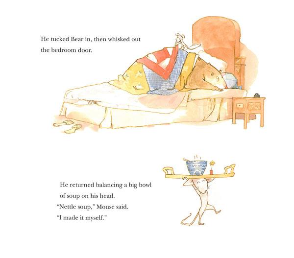 And on it goes. Mouse tries his best to comfort poor Bear. He drags him up the stairs, tucks him into bed and serves him nettle soup (which Bear thinks tastes like spinach and straw). But Bear is still dreadfully and dramatically ill! There is will dictation (“I leave my red roller skates to . . .”), some dramatic shouting and finally . . . sleep.