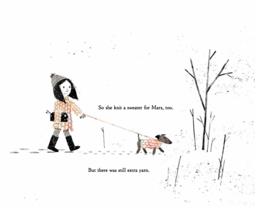This story is set in a dreary little town. Cold invades and everything is black with soot or white with snow. When Annabelle finds a box filled with multi-coloured yarn, she is quite inspired. Soon she has knit herself and her dog Mars cozy sweaters perfect for brisk walks outside.