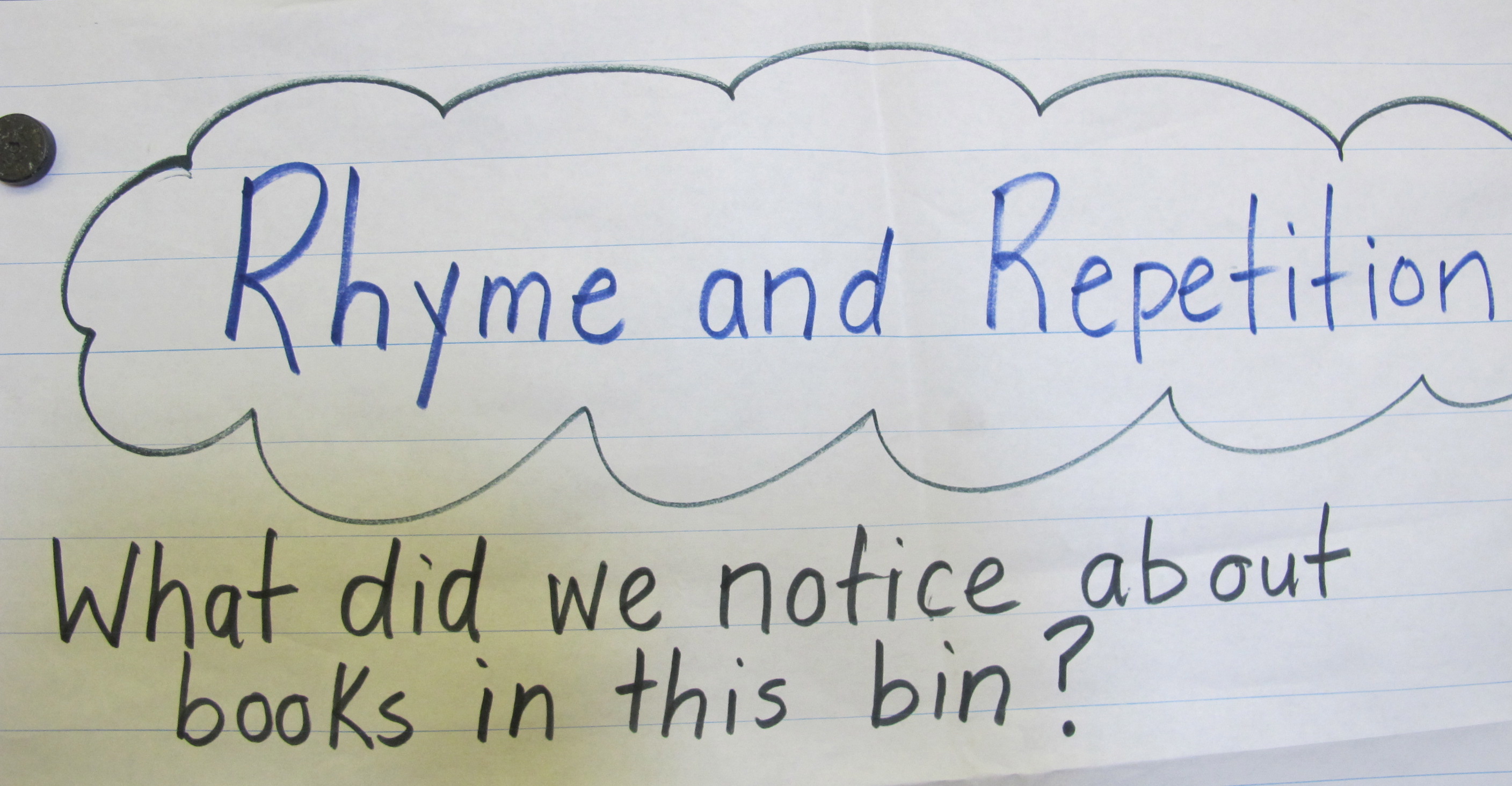 I brought out this bin and students predicted that many of these titles would have rhyming parts and selections of text that repeated (the title of the bin made this prediction a pretty easy one :-)) I read a few pages of a few books to model exactly that. We identified how often ending words rhymed and that sentence structure or specific phrases repeat. Students then helped me spread the books out on the carpet and every child spent fifteen minutes reading a variety of titles from this set of books.
