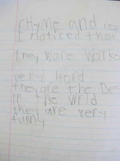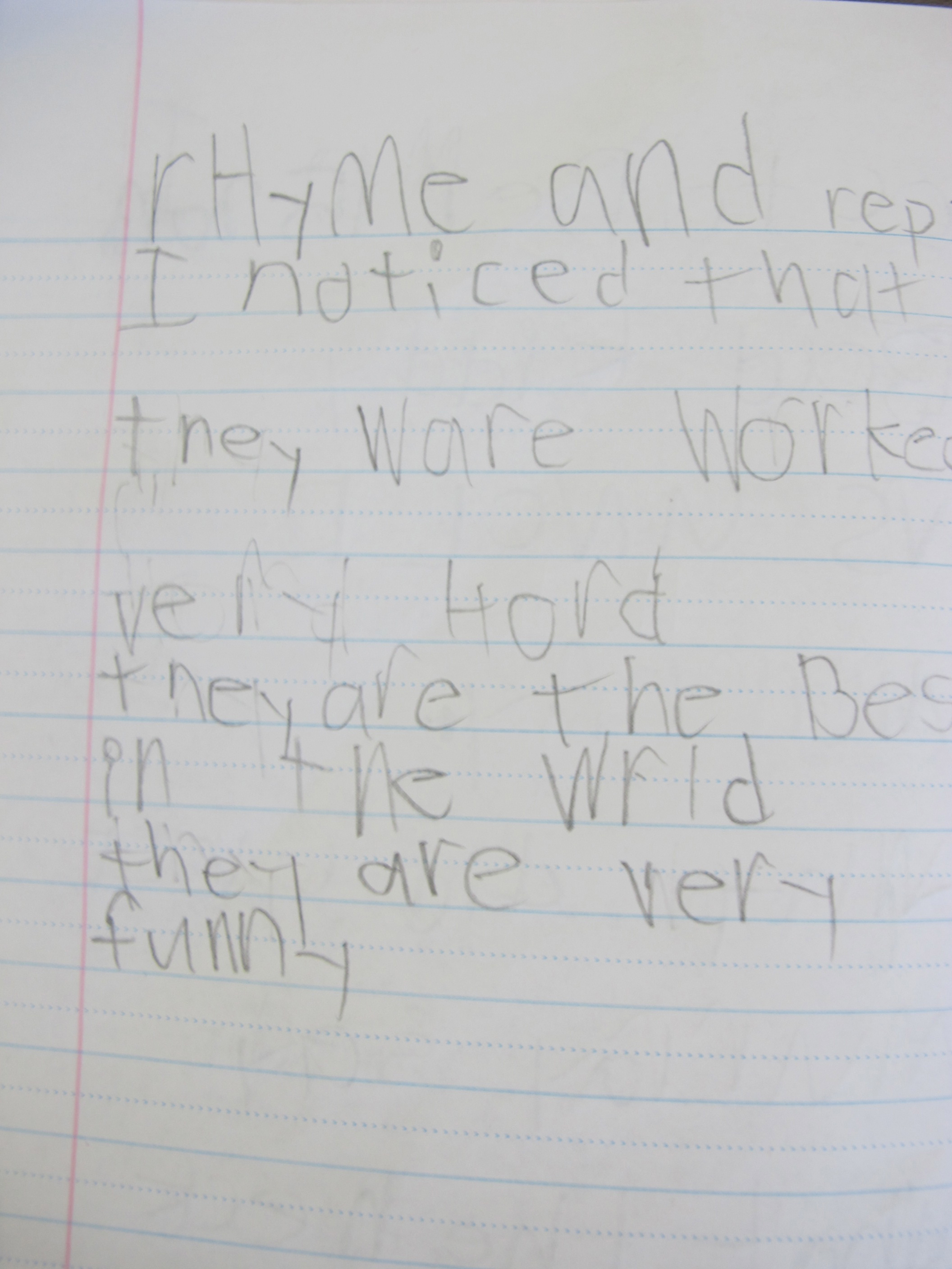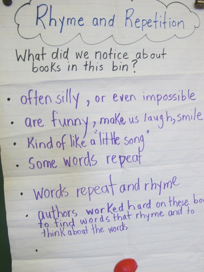 Our list definitely included the rhyming and the repeating but students started with the fun aspect of the stories pointing out that they were often silly, farfetched and funny. It was clear that the word play brought a lightness to the books. One student even commented that the authors would have to work very hard to make all the words work together.