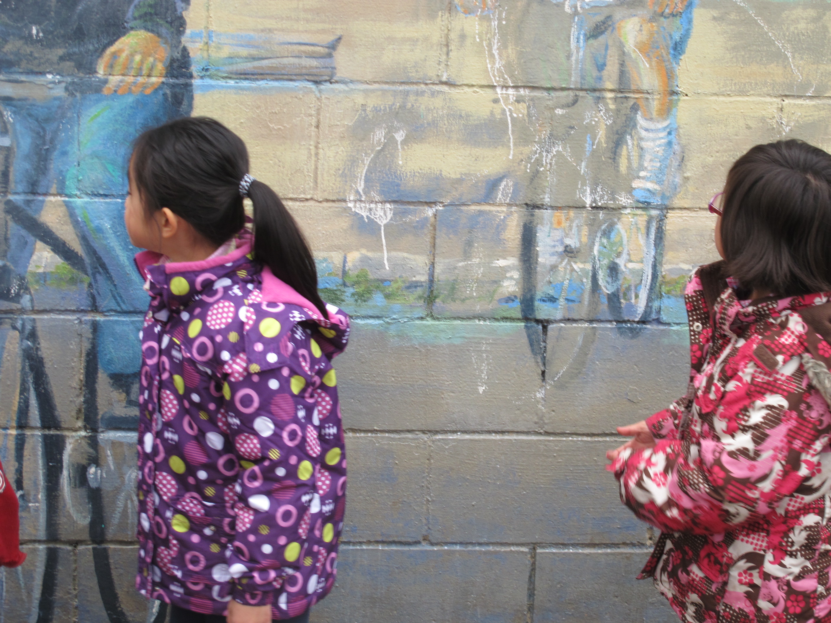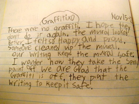 After the excitement toned down, we talked about what we noticed, what we felt and why we thought OTL Catering had shared our words. Many students agreed that they felt happy, excited and relieved that the mural could be saved. Some felt proud to have their thoughts displayed. One child commented,”If people see what we wrote, they will know that kids are upset and sad and they might care more to not make any more graffiti. People don’t like to make kids sad.” Many said that we helped the wall be more powerful.