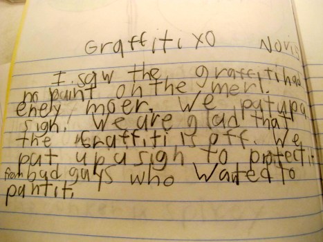 Back in class we decided to write about this subject one more time. We had a big discussion about possible titles for our reaction. “Let’s call it Graffiti x 0 because now there is no graffiti!” “We should call it Graffiti All Gone.” “I’m going to call mine Graffiti Keep Away!