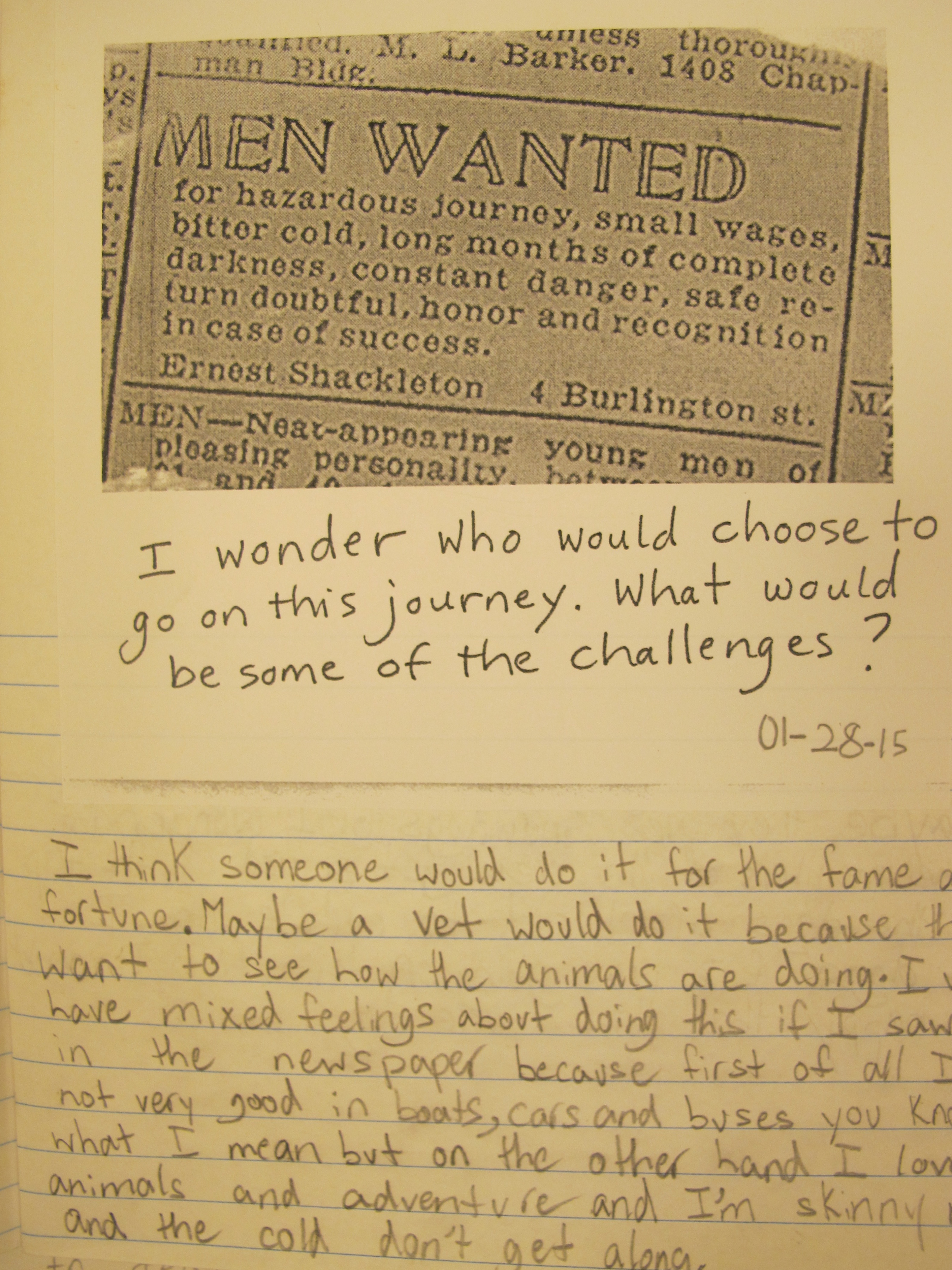 We did a writing exercise with a copy of Shackleton’s actual advertisement for men to sail with him on the Endurance. I gave this wonder statement as a prompt: