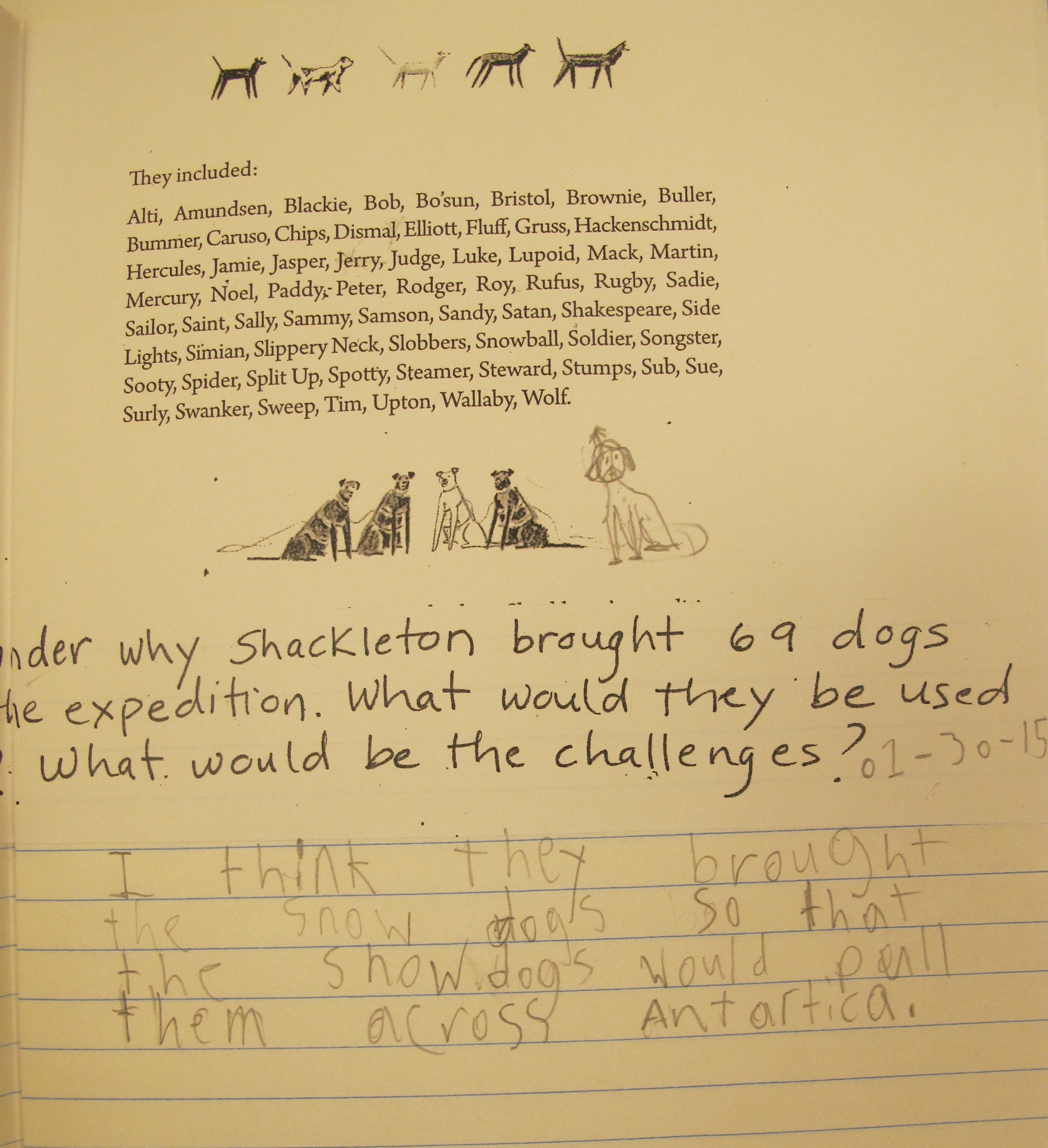 After reading a few pages about recruiting men and raising funds, it was all about the dogs! 69 dogs were brought on board as part of the expedition. Each of their names is listed. I had to read the list aloud multiple times. “Do it again,” I would be prompted. 🙂 I then had to make a copy of the list for the students. We used this as another writing prompt.