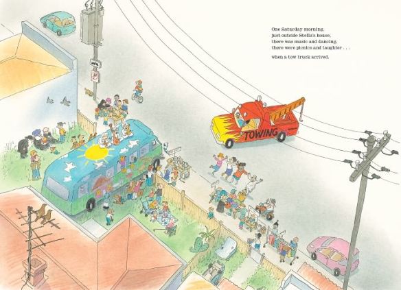 There isn’t a huge amount of story here, no action filled plot. Rather there is a whole lot of moment. Family. Time together. Celebration. A Park. A picnic. Lots of community. And . . . love the multiethnic parents depicted! Takes me back to the slower pace of having little ones still in babyhood.