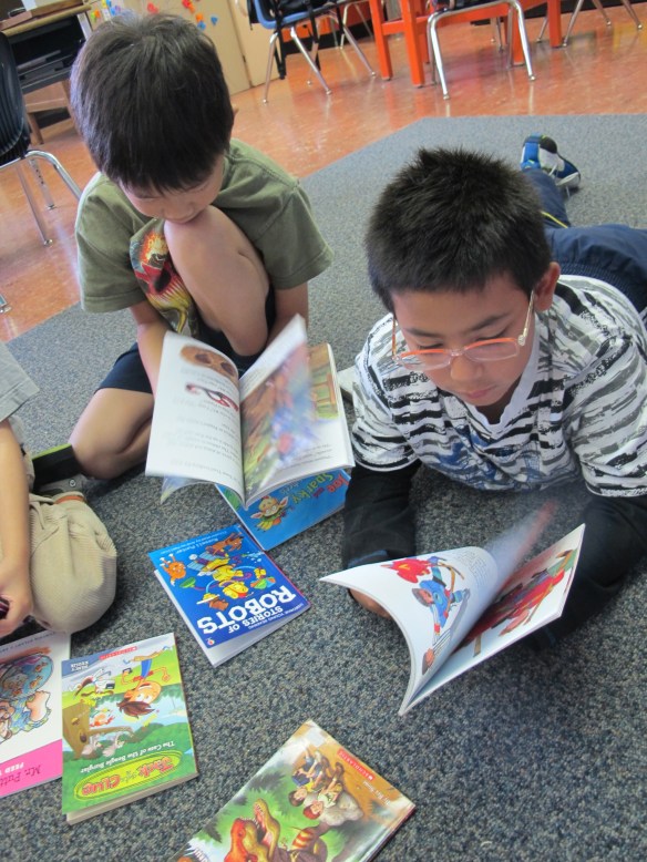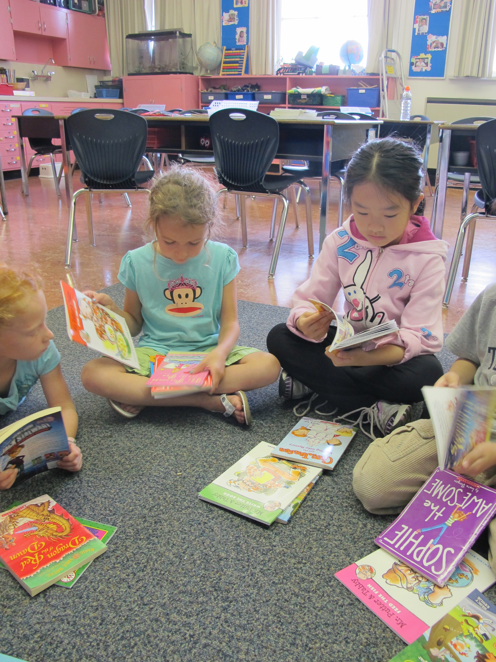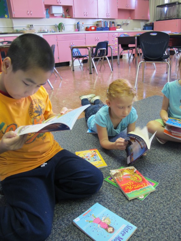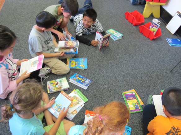 A great way to introduce more titles is also through book sharing circles. I group children into small groups of 6-8 students and have enough for 2-3 books per child. Every few minutes, we pass the books to our left and have a small amount of time to explore the titles just passed to us. At the end, we place all of the books in the center of the circle and students have a chance to share which books would be their first choices to read “next.” These conversations help to further promote the excitement about the books and invariably, many of these books are nabbed as students head off to read.