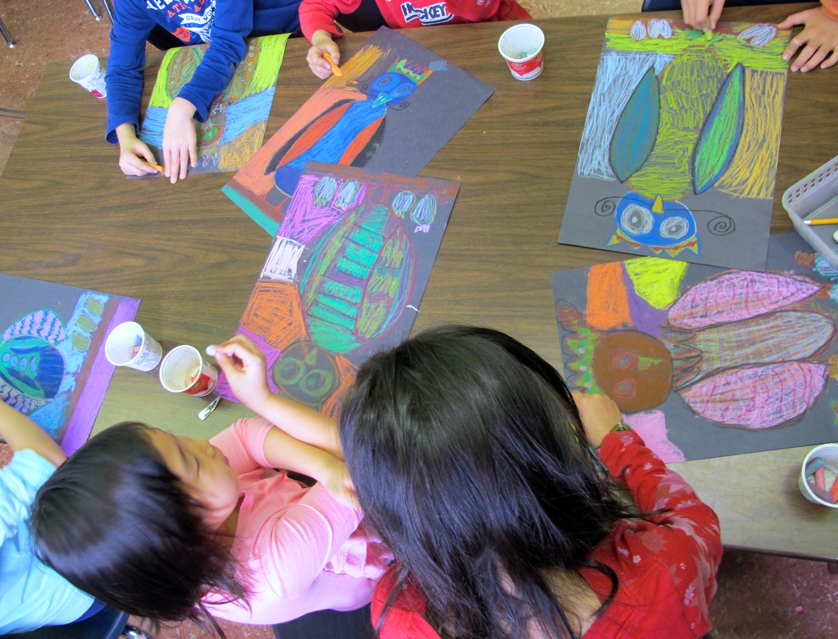 We completed two pieces of art to celebrate International Dot Day. I wanted students to approach their work playfully and to embrace the feeling of no one way to make an art piece. I discovered the wonderful blog of artist Michele Guieu and was blown away by all that she does. After resurfacing from her blog (prepare to spend hours!), I had the inspiration for our Dot Day pieces.