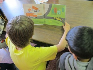 Recently I received some designated funds for my classroom book collections. I purchased board books for our buddy reading. My students will tell you that board books are great for little five year old hands and you don’t need to remind anybody to be gentle turning pages. Each morning I read a new book to my students with the intention of doing a few things. Of course, sparking excitement and interest in the new book is a priority. But I also model. “When you read to your little buddy you could ask them to guess which animal is on the next page,” I point out while sharing Monkey and Me by Emily Gravett. “Ask your little buddy to do the animal sounds with you,” I encourage as we read Alice Shertle’s Little Blue Truck. Now I have students coming to me with classroom books. “Look Ms. Gelson I could read this book to my little buddy and they could say the parts that repeat with me!” One girl found a Fairy Tale book told in rebus style. “This is a good one for little kids, you can ask them what the picture is.”  Thinking about our little buddies is hardly just a Wednesday afternoon event.