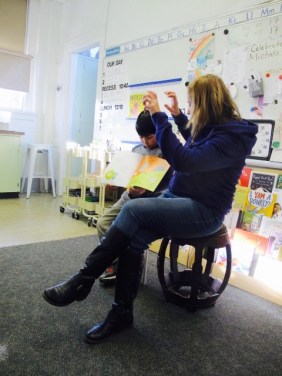 Each week I share at least one reading photo of the week. I love this photo of Ms. B who works in my classroom (and her helpful page turning assistant) reading a book to a group of avid listeners.