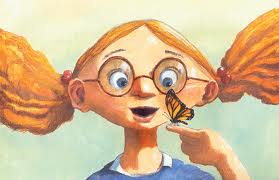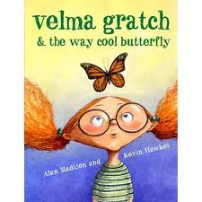 Look at that cover. Aren’t you just rooting for Velma before you even know her issues or struggles? Kevin Hawkes, illustrator, helps create a wonderfully unique character in Alan Madison’s Velma Gratch & the way cool butterfly. Velma arrives in first grade in the shadow of her two older sisters known for their seemingly perfect qualities – athletic abilities, spectacular spelling and marvelous math. Velma wanted to be noticed but for what? She chooses some quite foolish ways to stand out: running the slowest, singing the loudest, muddling her math . . . None bring quite the effect she is hoping for. Slowly, Velma learns to recognize a passion – science. When her class begins to learn about butterflies she twists wonderfully new words around in her mouth – metamorphosis, conservatory, migration. Not only does Velma come into her own as a butterfly expert, but on the class field trip to the conservatory, Velma is noticed by a monarch who lands on her finger and doesn’t leave for days.