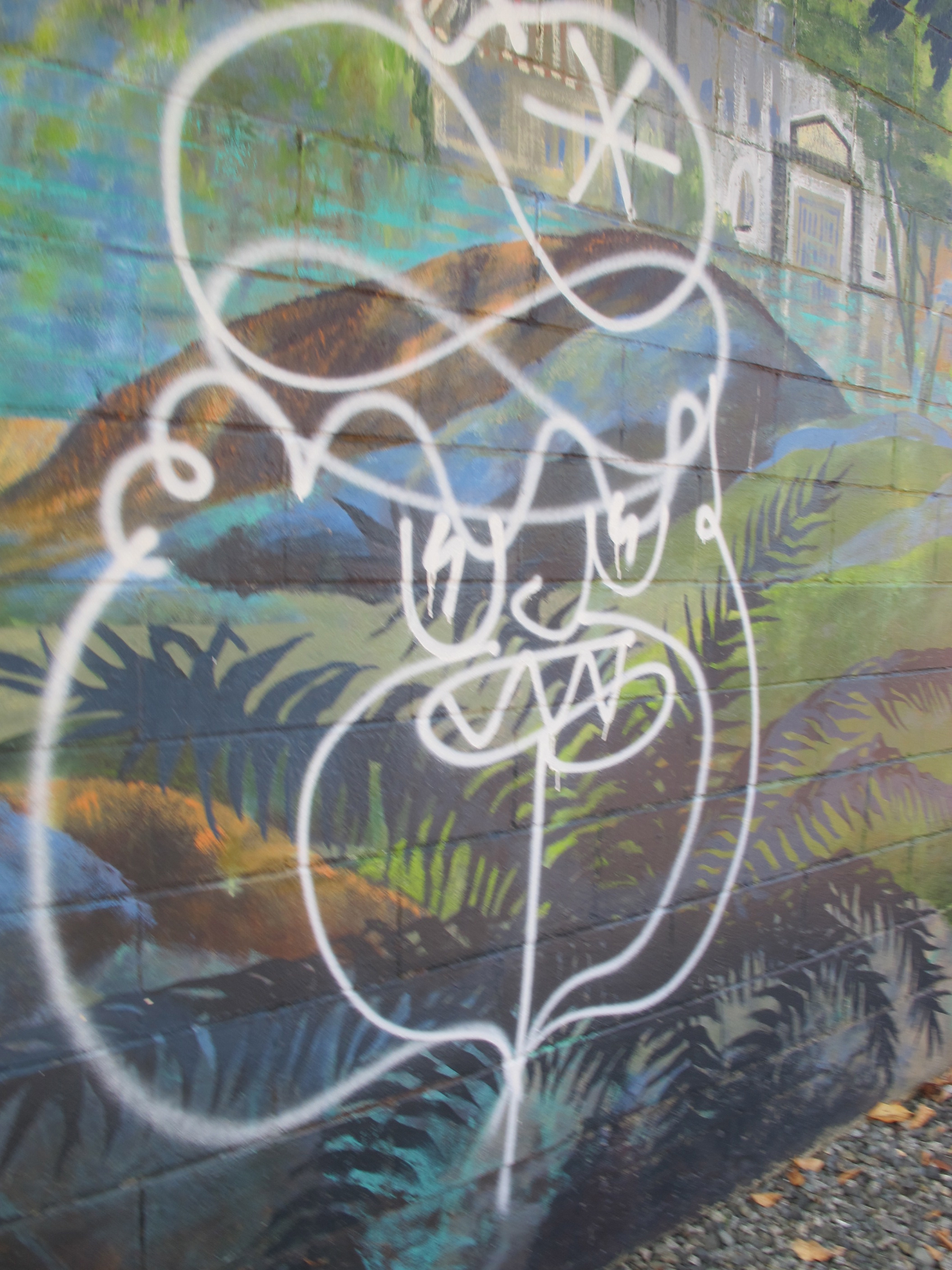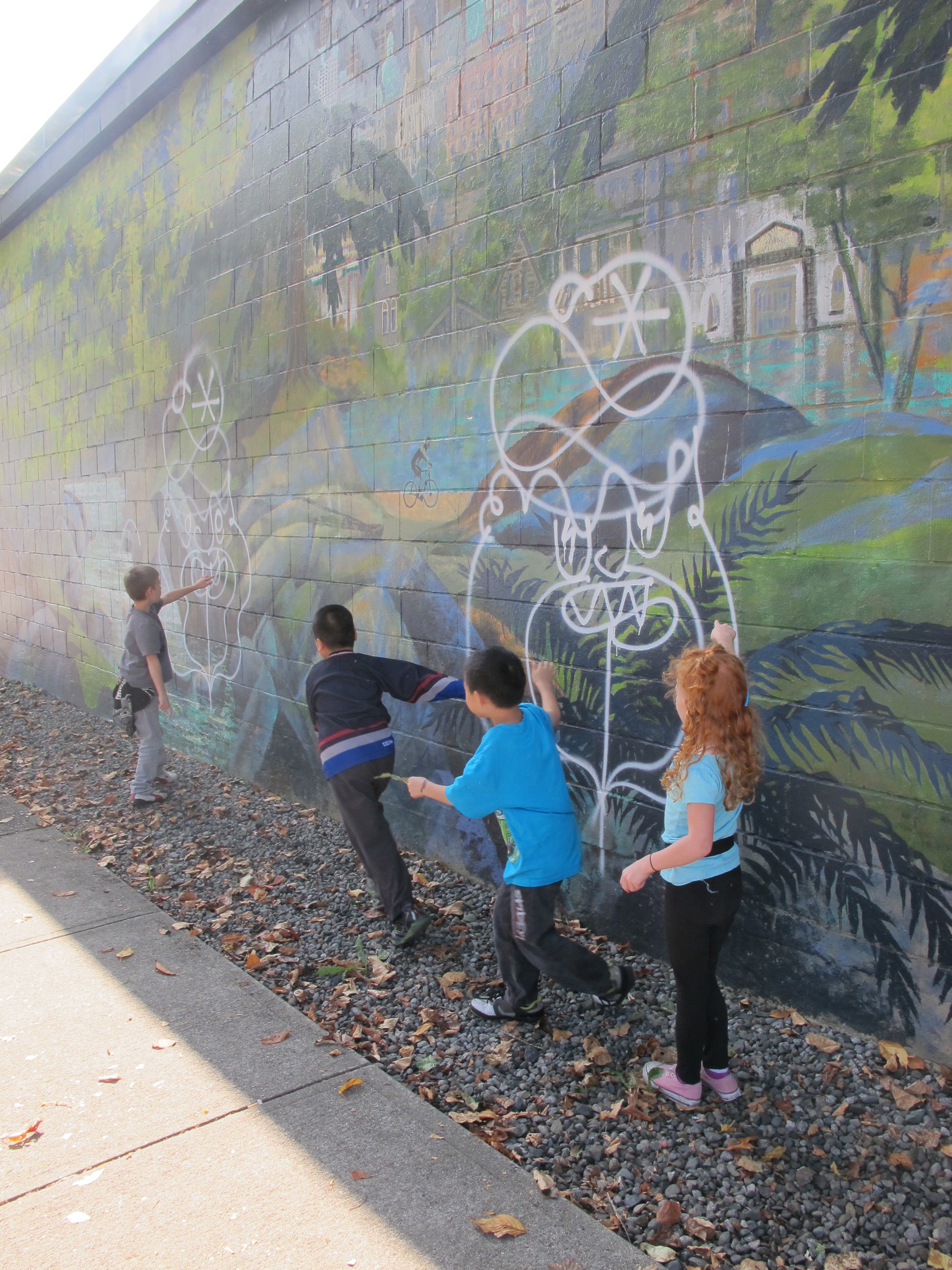 What are we celebrating? Big news in our school community! The graffiti covering the beautiful mural on the wall at Out to Lunch Catering (located just a block and a half from our school) has been washed off! While some traces of the graffiti can still be noticed up close, the mural we love can be seen again. And . . . a little “sign” leans up against one corner of the wall. On this wooden display hang our blog posts (read here and here to catch up on this story) featuring student thoughts and writing about the spray paint that covered this very wall in graffiti just over a month ago. The blog posts covered in plastic to protect them from the rain seem to stand guard in front of this newly clean wall.