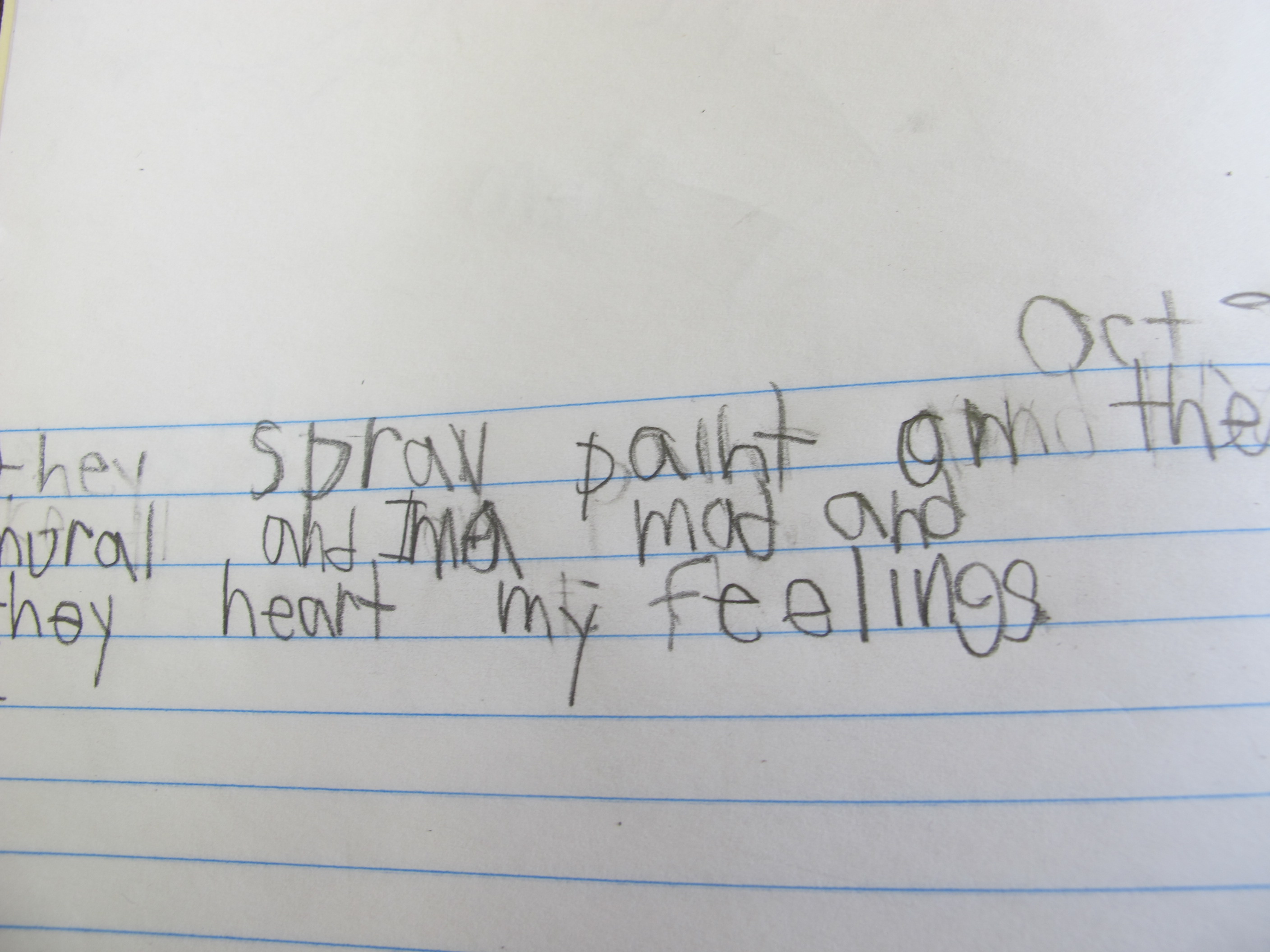 After the excitement toned down, we talked about what we noticed, what we felt and why we thought OTL Catering had shared our words. Many students agreed that they felt happy, excited and relieved that the mural could be saved. Some felt proud to have their thoughts displayed. One child commented,”If people see what we wrote, they will know that kids are upset and sad and they might care more to not make any more graffiti. People don’t like to make kids sad.” Many said that we helped the wall be more powerful.